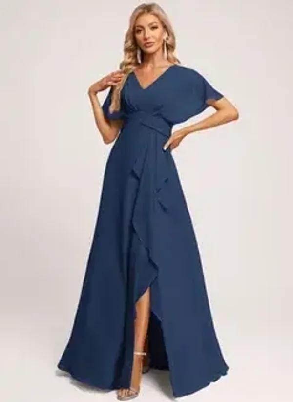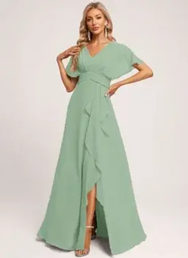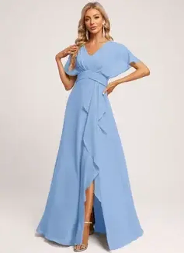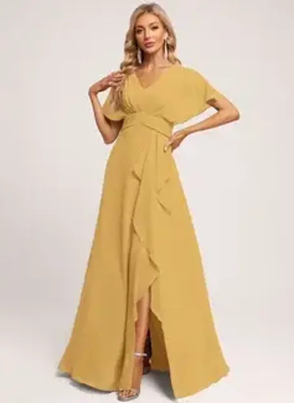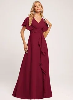 Robe de demoiselle d'honneur trapèze col v longueur ras du sol mousseline avec volants